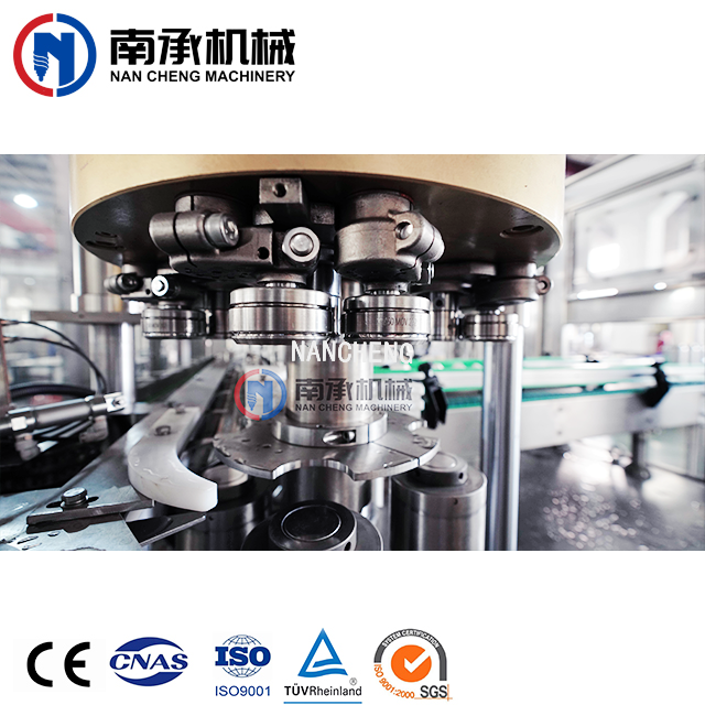 易拉罐灌裝機(jī)采用常壓灌裝原理,當(dāng)空罐經(jīng)撥輪進(jìn)入升降托罐盤后,灌裝閥和空罐對(duì)中,空罐升起并密封同時(shí)自動(dòng)打開灌裝閥的閥口,當(dāng)灌裝液面堵住閥的回氣管口時(shí)停止灌裝。灌裝桶采用環(huán)形桶結(jié)構(gòu),減少了生產(chǎn)過程中的灌裝桶的重量,使易拉罐生產(chǎn)設(shè)備在旋轉(zhuǎn)過程中穩(wěn)定,料液通過管路系統(tǒng)從易拉罐灌裝機(jī)底部進(jìn)入灌裝桶內(nèi),可減少物料的沖擊,并能有效防止起泡,使灌裝精度高。
