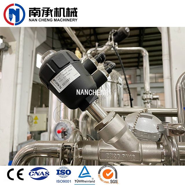 其工藝過程為:糖漿和凈水經(jīng)配比器按比例進(jìn)入混合罐混合,用泵輸入碳酸化罐,在碳酸化罐內(nèi)裝有管,罐內(nèi)通有制冷劑、使混合后的物料冷卻,以融入足夠的二氧化碳。為保證二氧化碳與處理水有足夠的接觸時(shí)間,二氧化碳從進(jìn)入碳酸化罐之間就開始充入。碳酸化后的物料進(jìn)入灌裝機(jī),然后灌入容器中張家港市南承機(jī)械有限公司